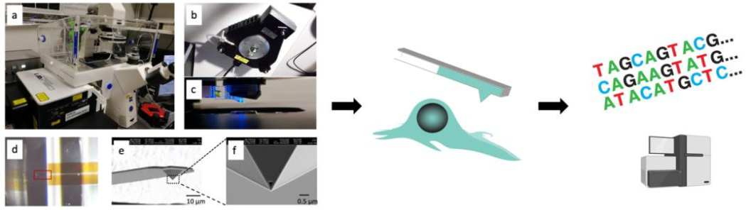 当然,如此精细的操作肯定需要更加精密、分辨率更高的仪器来进行。陈万泽刚开始尝试利用在细胞领域相对比较小众的原子力显微镜来逐渐优化自己的想法。原子力显微镜有一个很尖的硅探针,用于探测物质表面性质。陈万泽团队对这个探针进行了一系列的改造,包括表面活化、修饰等等,让探针能够在扎入细胞质的同时吸附出胞质内的RNA。但是改造的成本和探针成本都比较高,且成功率在当时还比较低。