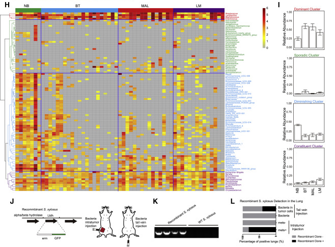 为了可视化肿瘤转移过程中微生物群的动态变化,研究人员绘制了不同样本中不同细菌属的丰度,以NB、BT、MAL、LM的顺序作为肿瘤进展的指示。有趣的是,无监督聚类将细菌分为具有不同动态模式的四类(图4H和4I)。显性聚类增加了乳腺组织中的丰度,微转移持续,大转移减少(图4H和4I)。